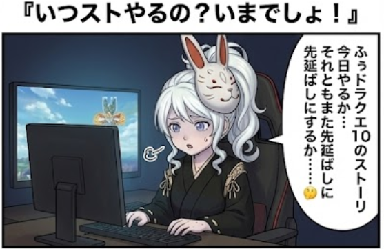 今回は、ととふもだいすき『ゆうきゆうさん』の心理学ツイートから、ドラクエのストを先延ばしたくなる気持ちを四コマ漫画にしてみました。
