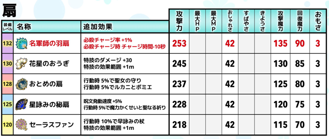 ・風斬り用最適: デスマスク装備を前提とすれば輝天のおうぎの上位互換に。