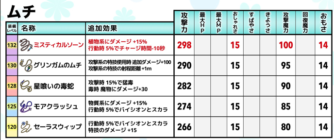 メゼまもの使いは一角でCT短縮の効果を得られる為、射程が長く・追加攻撃もある「グリンガムのムチ」から買い換える必要なし。