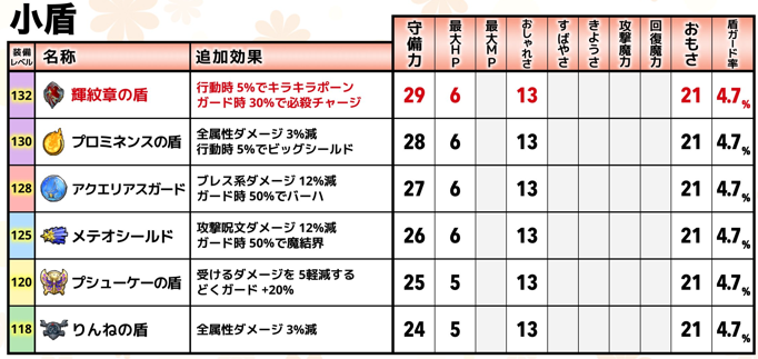 もちろん、アクエリアス(ブレス100狙い)、メテオシールド(呪文耐性特化)、耐性を揃えたい人は、が必要なケースはあるものの、それ以外の用途では必殺チャージが強い現状ではこの小盾を使うことになるのではないかと思います。 -