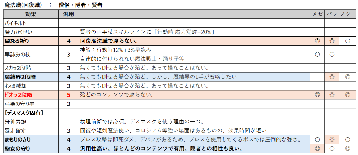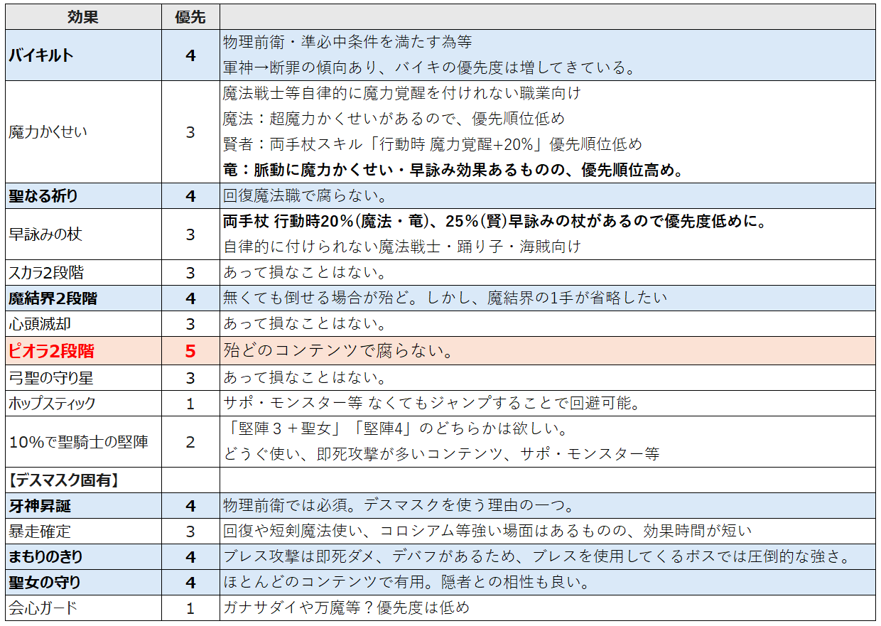 ですが、これだけだと具体的にどのようなデスマスクを作ればよいのかハッキリしないので、現在主流のエンドボスを中心に、物理・魔法アタッカー向け、回復職向けとして纏めてみました。