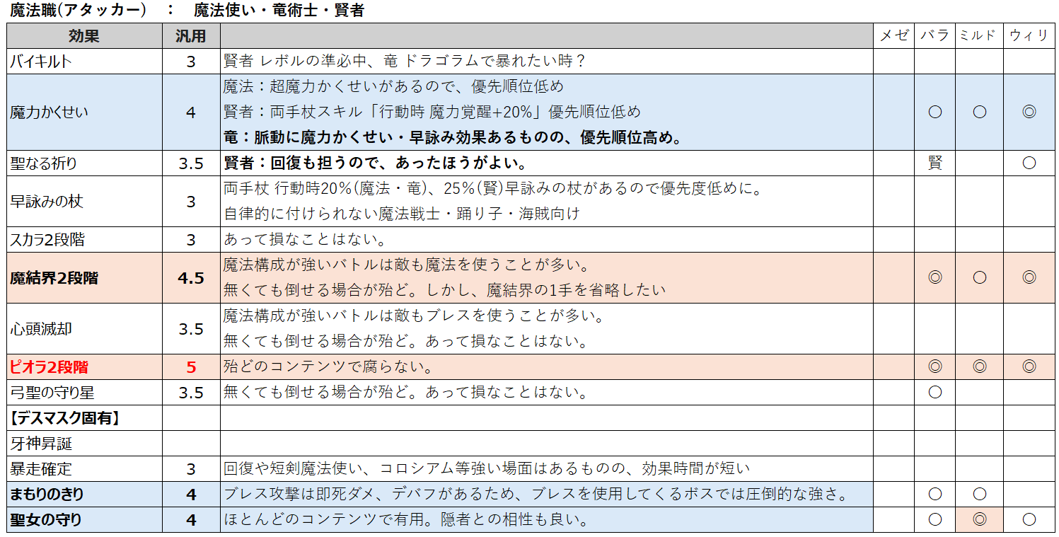 魔法戦士はクロックチャージでピオラ2段階をPTに撒けるので、ピオラの重要性を一段階落としてよさそうです。マダンテ等の攻撃魔法の威力を強くすることを考えて、魔力かくせい・早詠みを入れたいところですね。