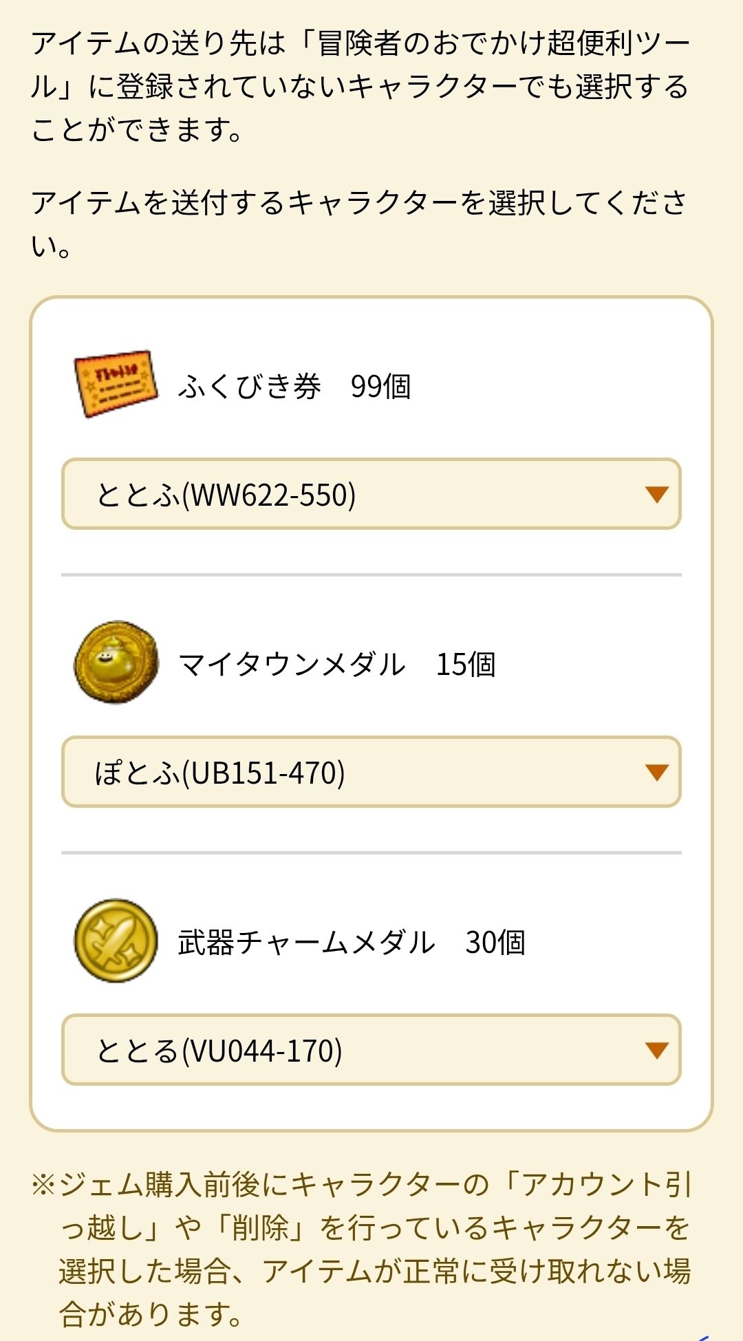 マイタウンメダルや武器チャームメダルを受け取るキャラを選択することができるので、あともう少しで貯まりそうってキャラにメダルを送ることが可能です!!