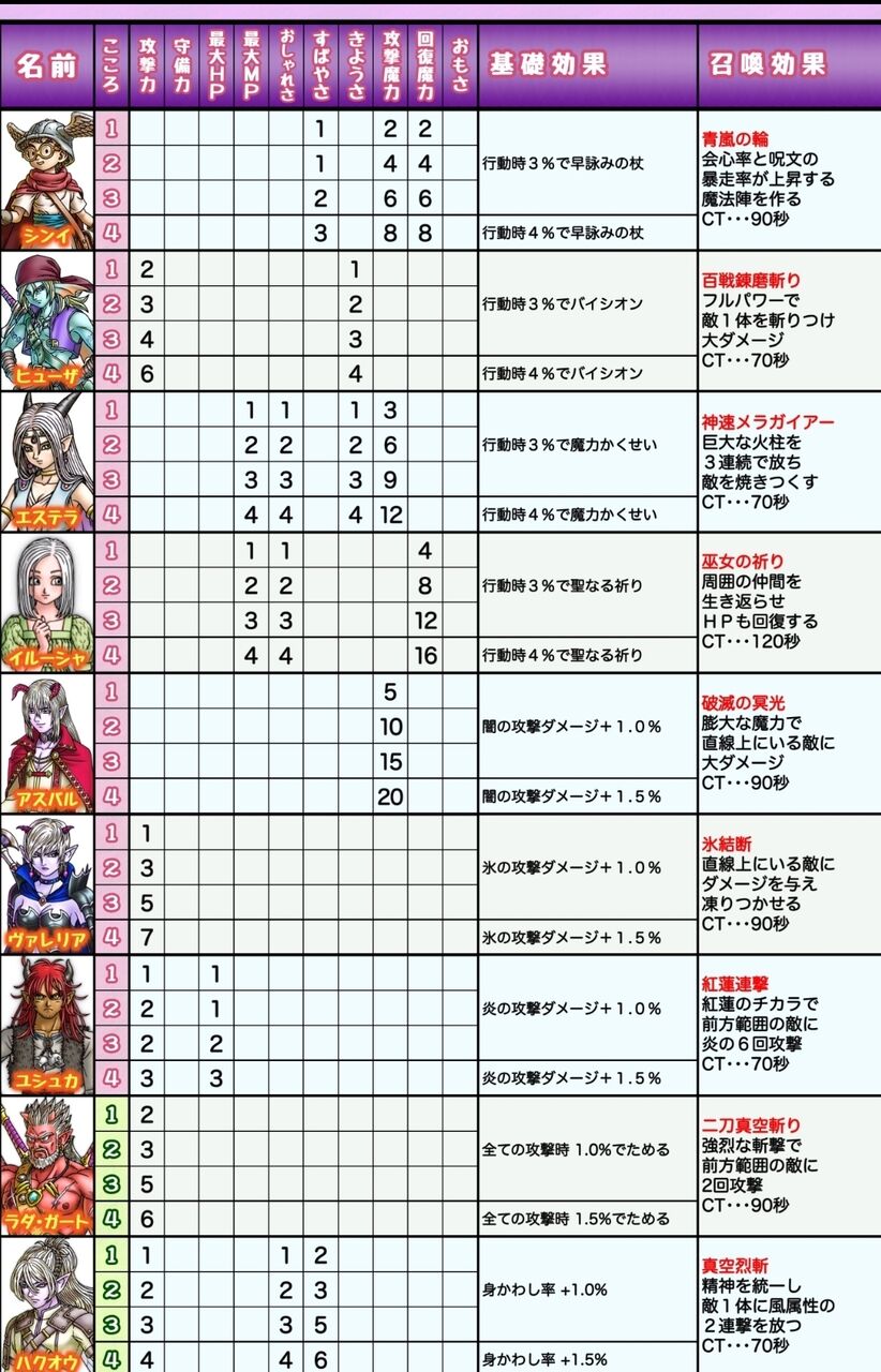各キャラクターの「こころ」の能力についてまとめてみました(2まで)バージョン7.0の時点では「こころ4」まで上げられるそうなので、来週以降ステータスが判明したら更新していきます🥷
