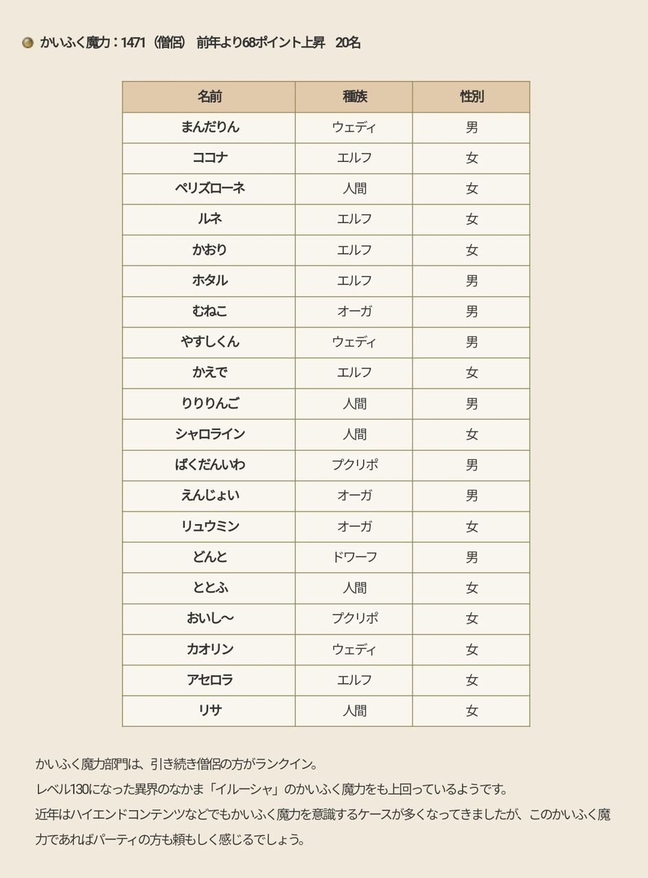ステータスの国勢調査が、デルメゼ用僧侶などで、回復魔力を重視してる処でいけそうだったので、