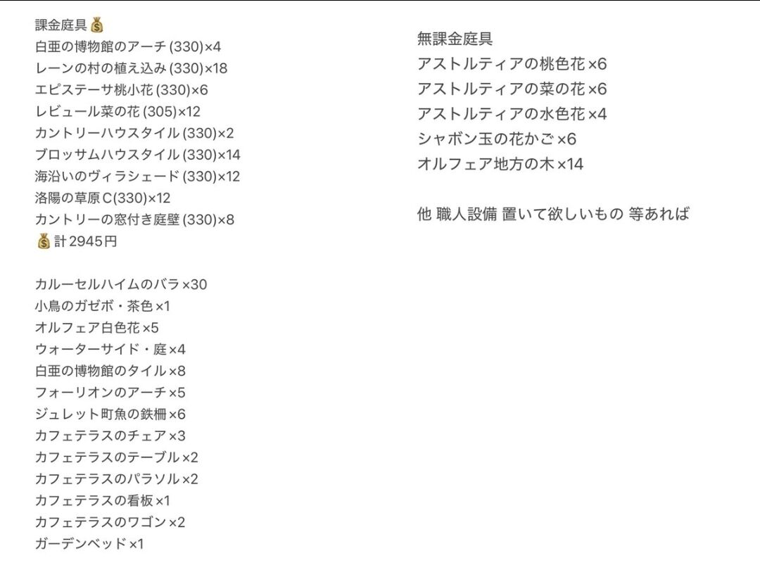 すると、ほんとに5分ぐらいで、課金額に合わせて買ってほしい庭具リストが送られてきて…