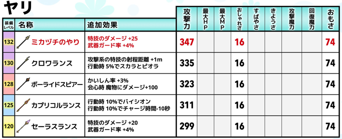 • 特徴: 特技ダメージアップ、武器ガード率アップ。「セーラスランス」の上位。