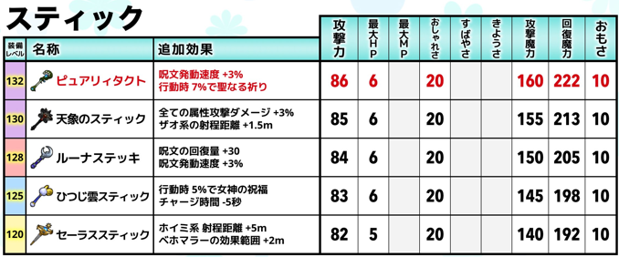 サターンロッドの攻撃力は、攻撃力285、攻撃魔力85、回復魔力75から、それぞれ+61、+25、+25と基礎ステータスが上がっているので、サターンロッドからの買い換えはありかもしれない。