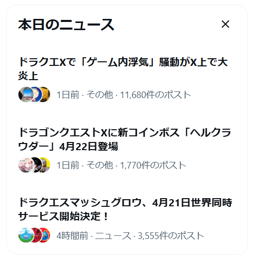 例えば、ある対戦ゲームで「強すぎた武器が弱体化(ナーフ)された」という話題が、そのゲーマー村の中でわちゃわちゃと1万件ポストされたとしますよね。社会全体から見れば小さな出来事かもしれませんが、Xのアルゴリズムは「あなたの村で大事件が起きているぞ!!」と判断して、ニュースタブのトップにデカデカと掲示してきたりするんです!